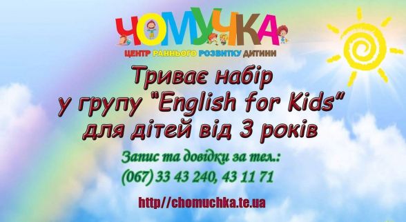 Окремо проводиться навчання англійської мови “English for Kids”, Невеликі групи (5 – 6 діток), які вивчають англійську у приємній та дружній атмосфері для дітей віком від 3 до 6 років. У центрі «Чомучка» заняття з англійської мови проводяться у живій і цікавій формі. Діти не «вчать» англійську мову, а граються, співають, танцюють, дивляться казки, малюють, ось тільки мова звучить інша. Працює творча майстерня. У нас в центрі діти грають і співають, танцюють, малюють, знайомляться з буквами і цифрами, читають а також ліплять, клеять, майструють.