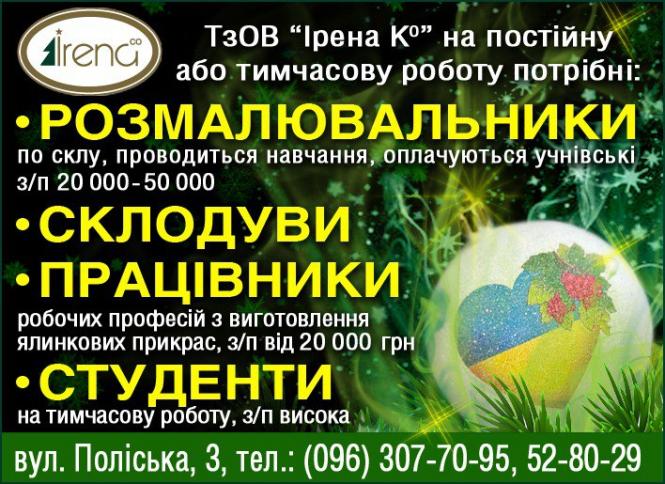 - Працівники з вигот. ялинкових прикрас, з/п від 15 000 грн,розмалювальники по склу, від 20 000 грн., склодуви, студенти, з/п висока 52-80-29, (096) 307-70-95