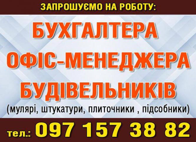 - Бухгалтер, офіс-менеджер, будівельники (мулярі, штукатури, плиточники, підсобники). (097) 157-38-82