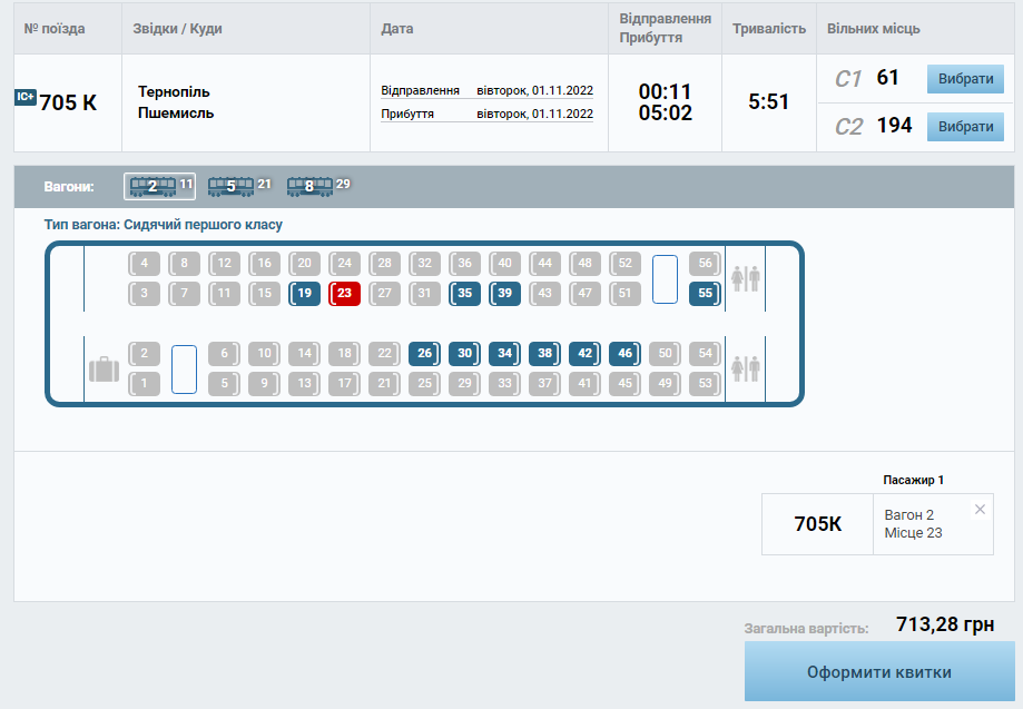 Вартість поїздки в одну сторону для тернополян у разі вибору місця в першому класі становитиме трохи більше 700 гривень.