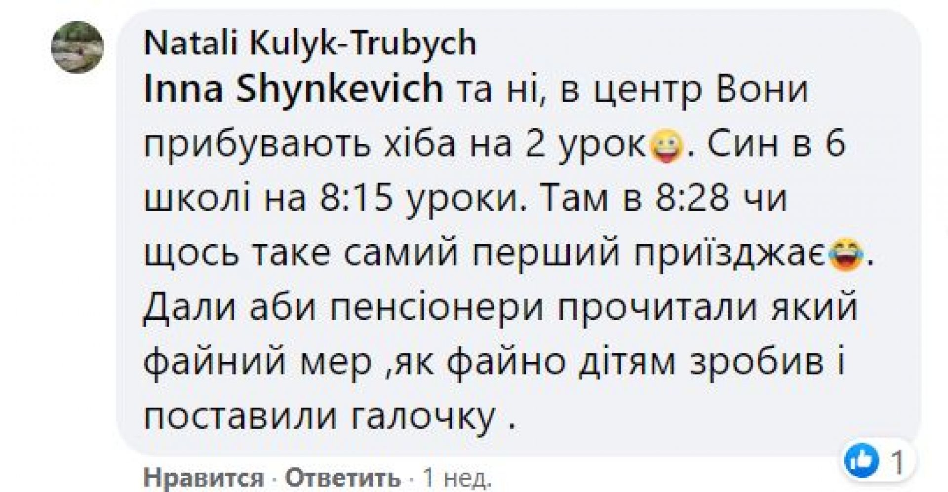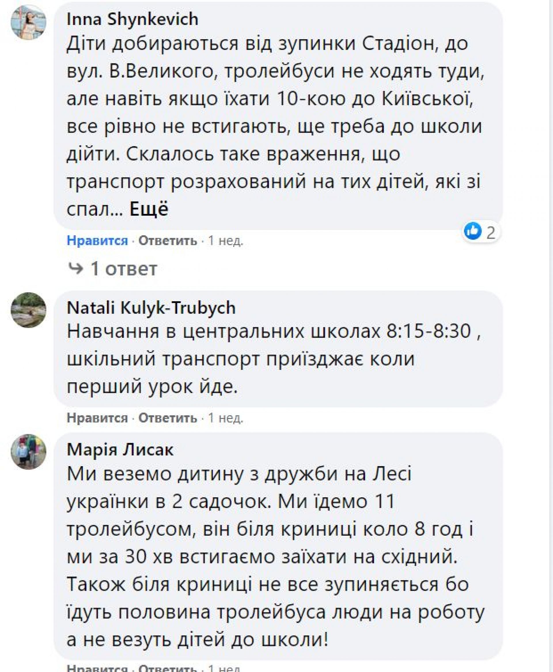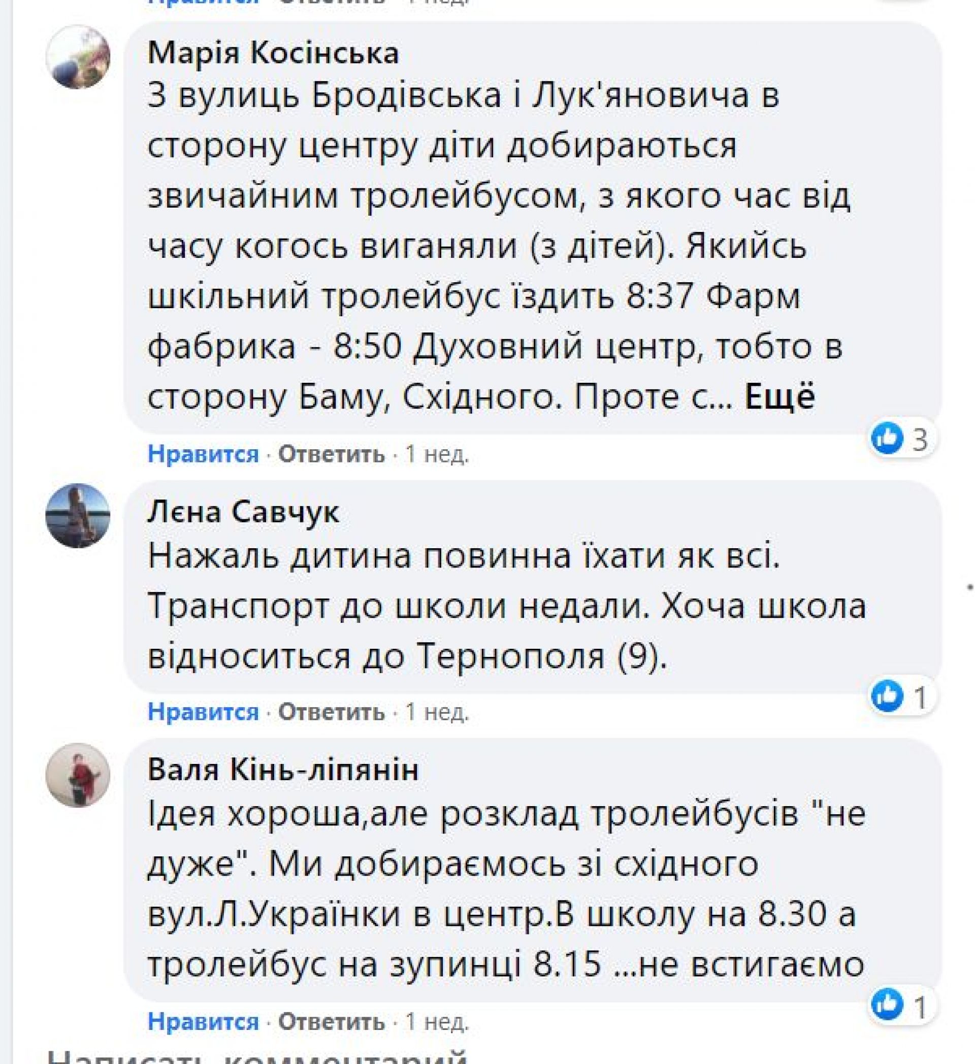 Ми запитали у тернопільських батьків, чи зручно користуватися шкільними тролейбусами. Більшість коментаторів обурюються через те, що шкільним транспортом діти доїжджають до шкіл тоді, коли перший урок вже триває. Через це школярі змушені у звичайний громадський транспорт, де не завжди вистачає місця. А до деяких шкіл транспорт і взагалі не курсує.