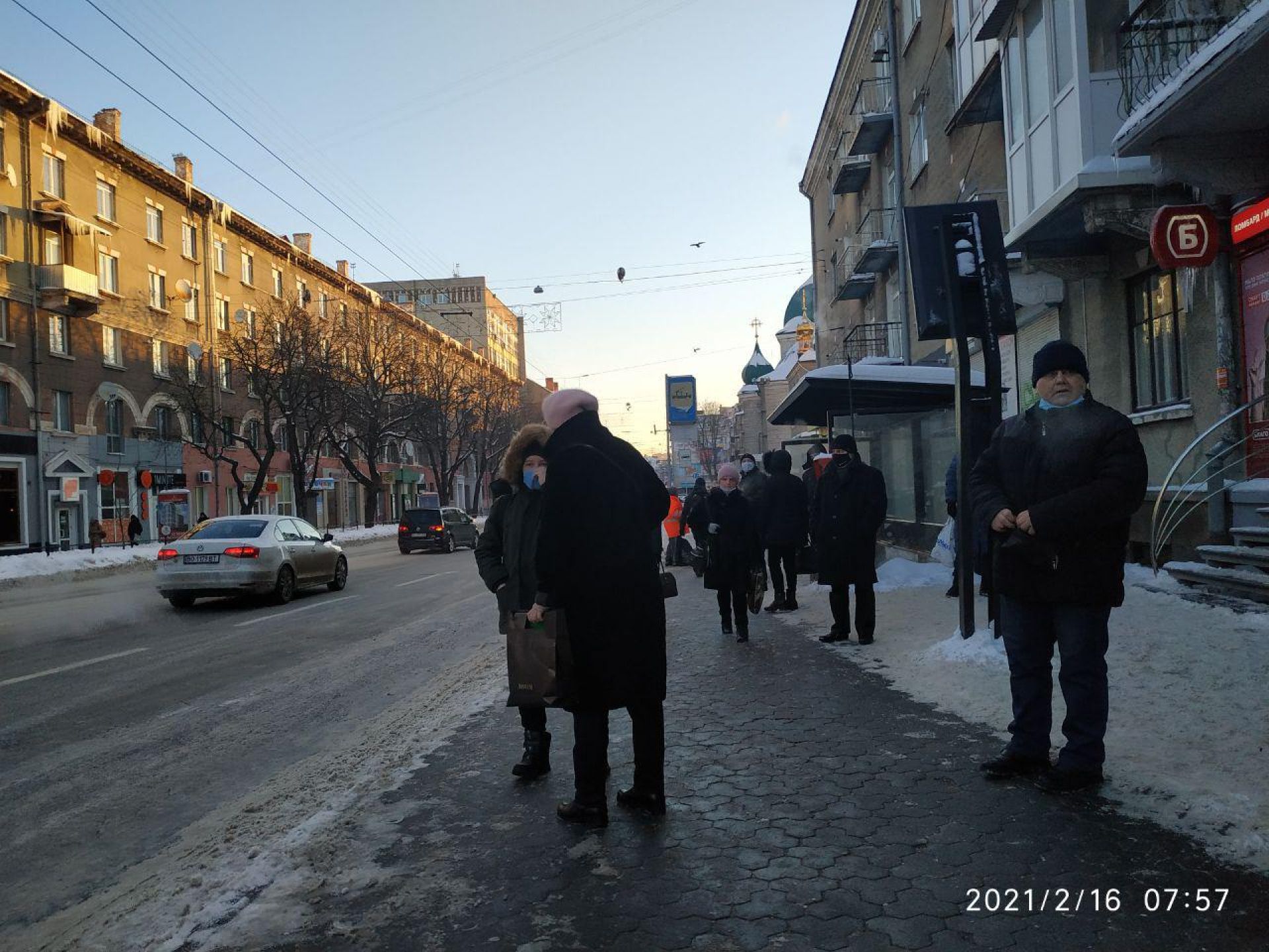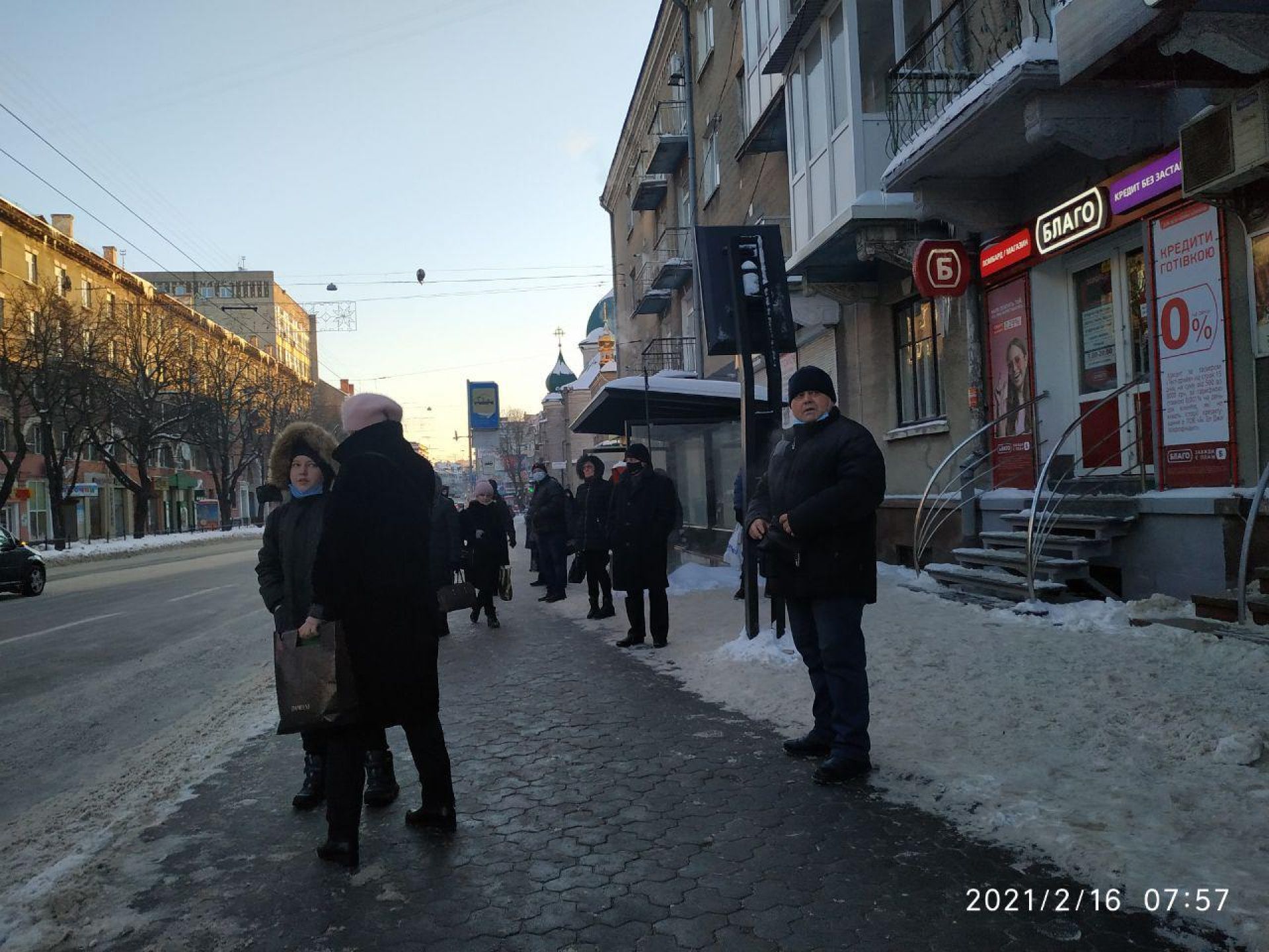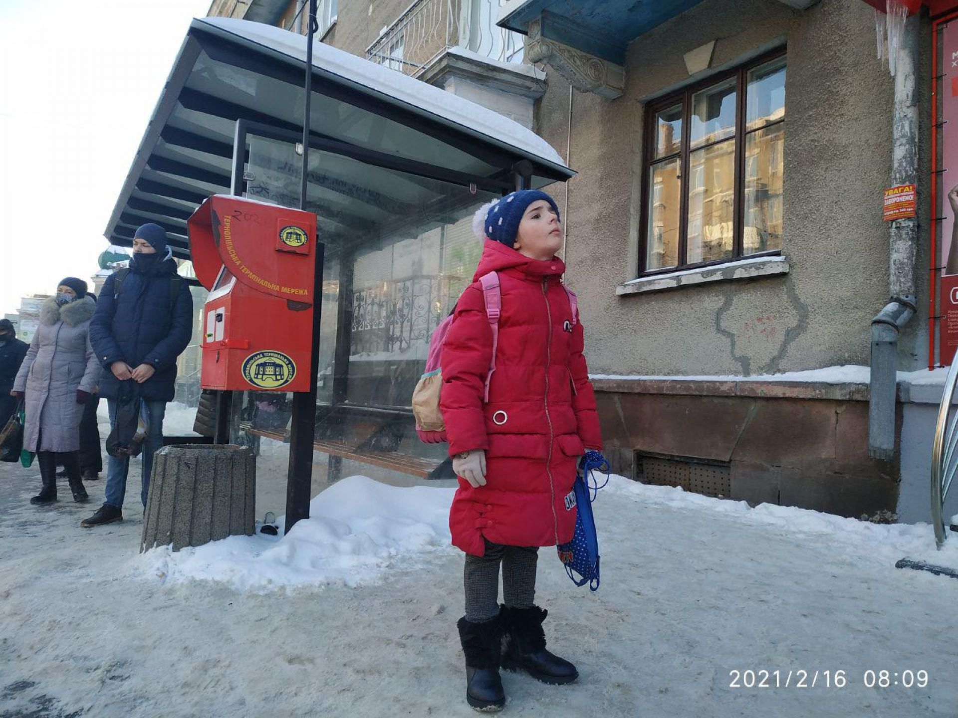 Масив «Дружба», зупинка на вулиці Мазепи. Очікуємо на транспорт разом з іншими. 11 лютого, на годиннику 7:54. На зупинці разом стоять ще 20 людей, з них майже половина діти.