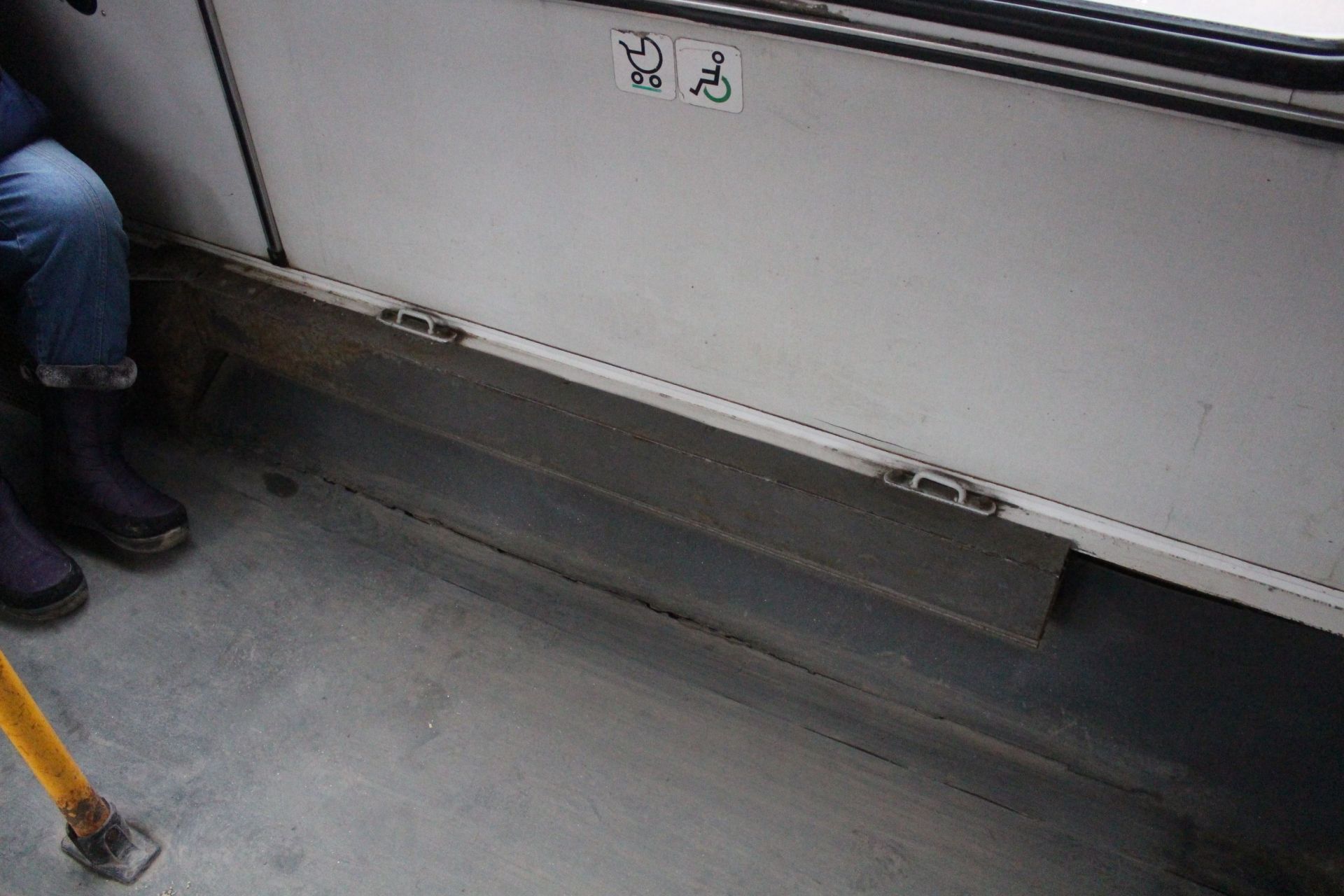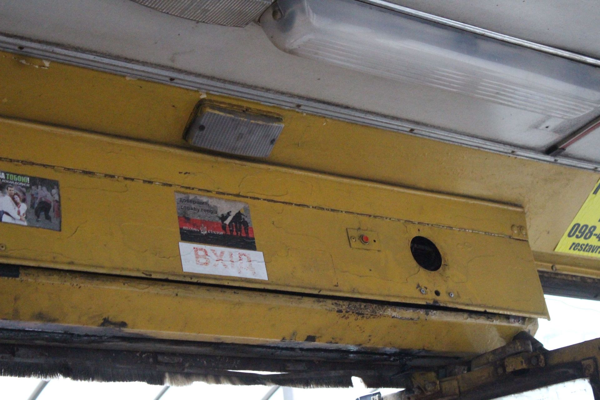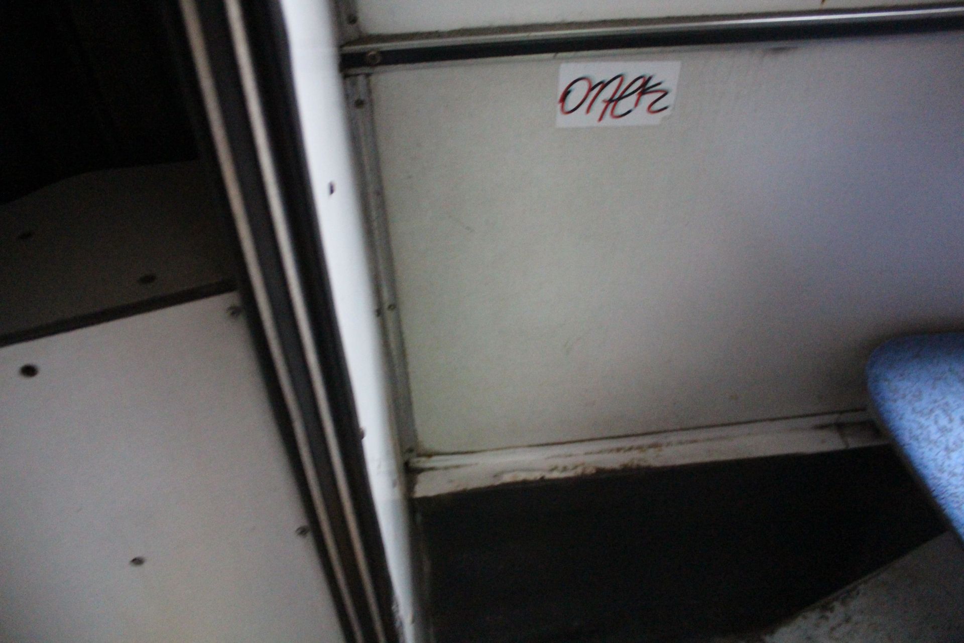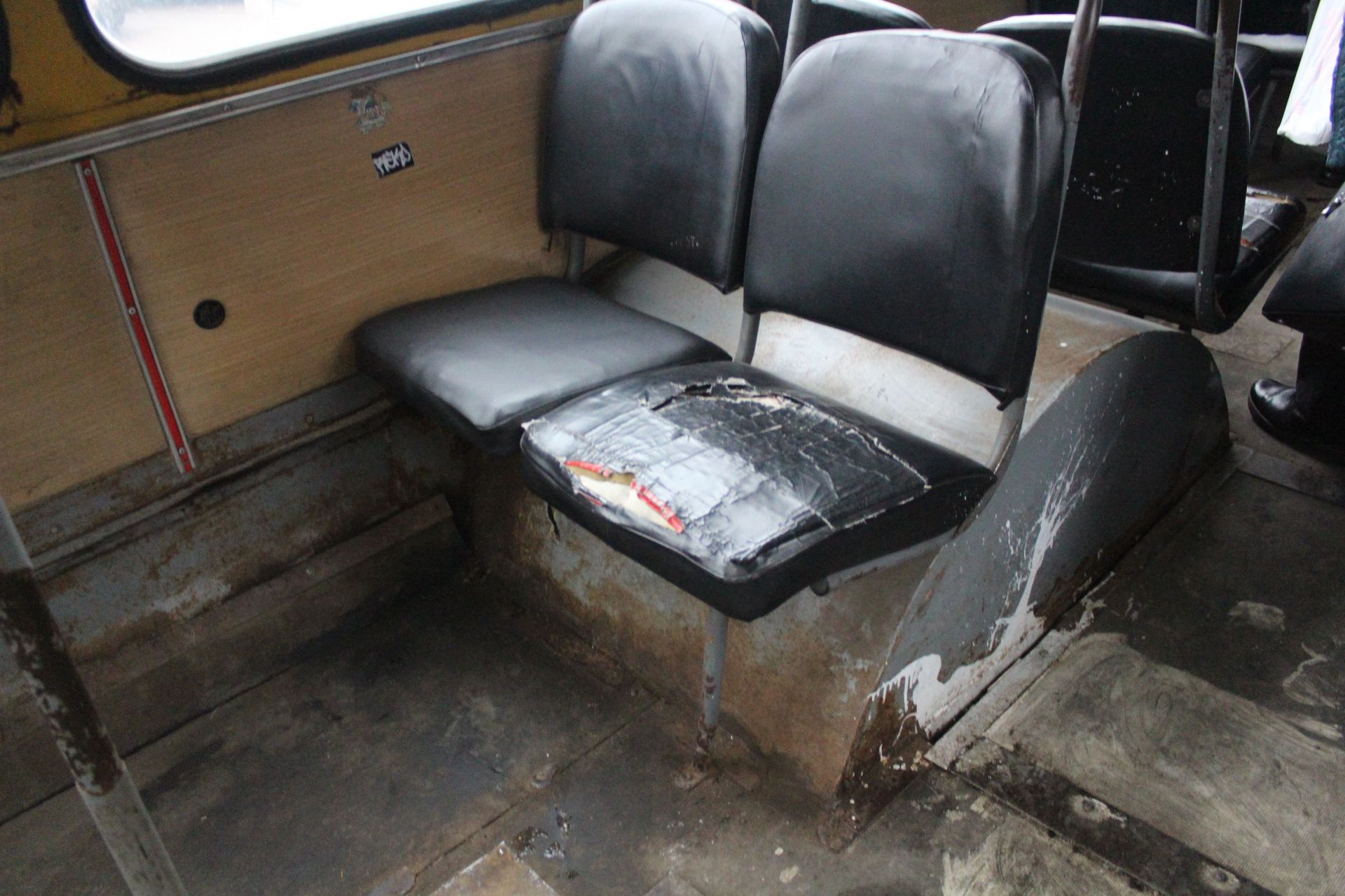 В середині він виглядає не краще. На багатьох сидіннях обшивка почала рватися. За нею видніється старий пожовклий поролон. Метал ржавіє. Особливо це помітно біля підлоги. Стара жовта фарба вже починає лущитися. На підлогу хтось розлив білу фарбу.