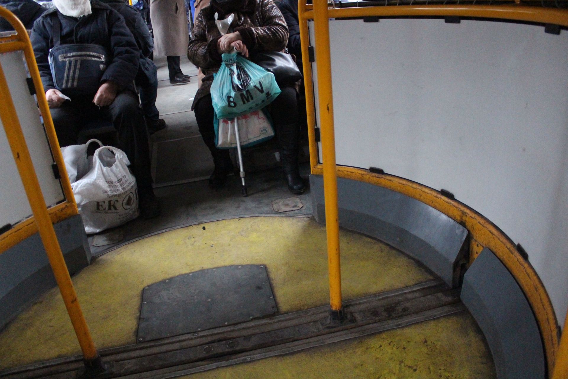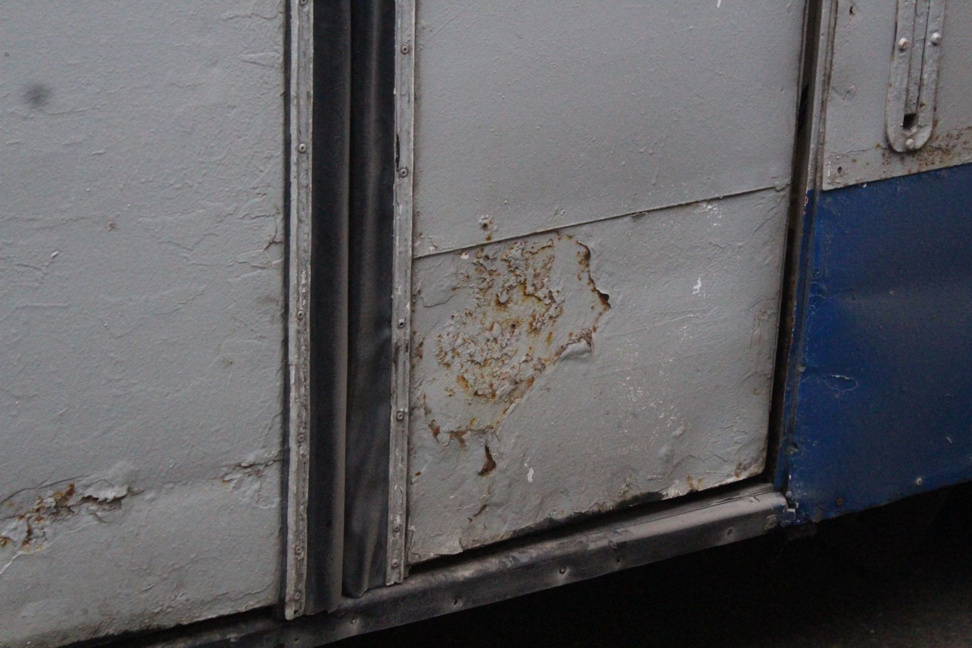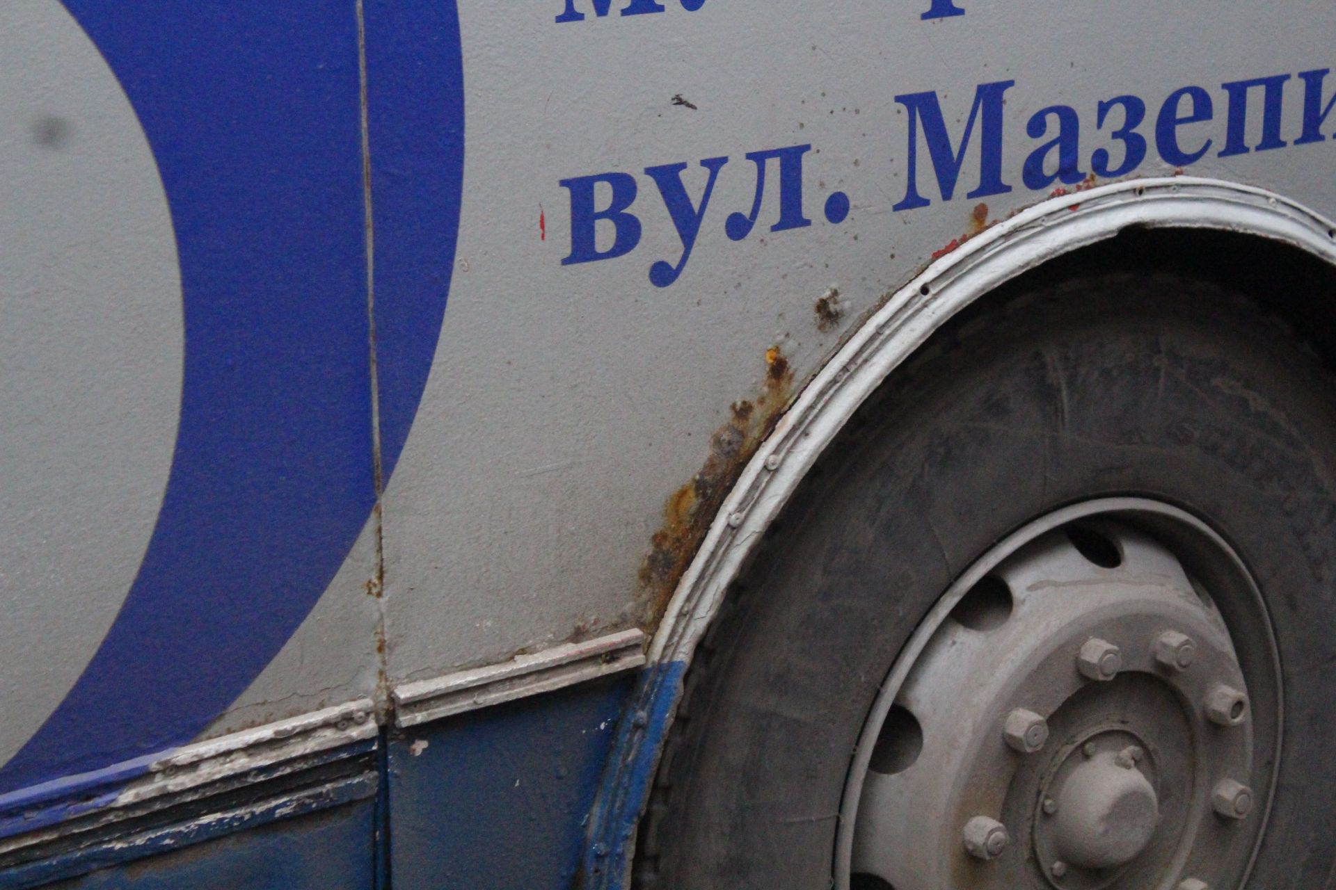 Перший під’їхав старенький тролейбус, який їде за маршутом №1. Зовні він не виглядає старим, однак якщо придивитися – можна побачити метал, який роз’їдає ржавчина. Кілька шарів фарби. Задні двері відчиняються погано. Пасажири, коли виходять з тролейбуса, руками привідчиняють двері, щоб вони швидше відкрились.