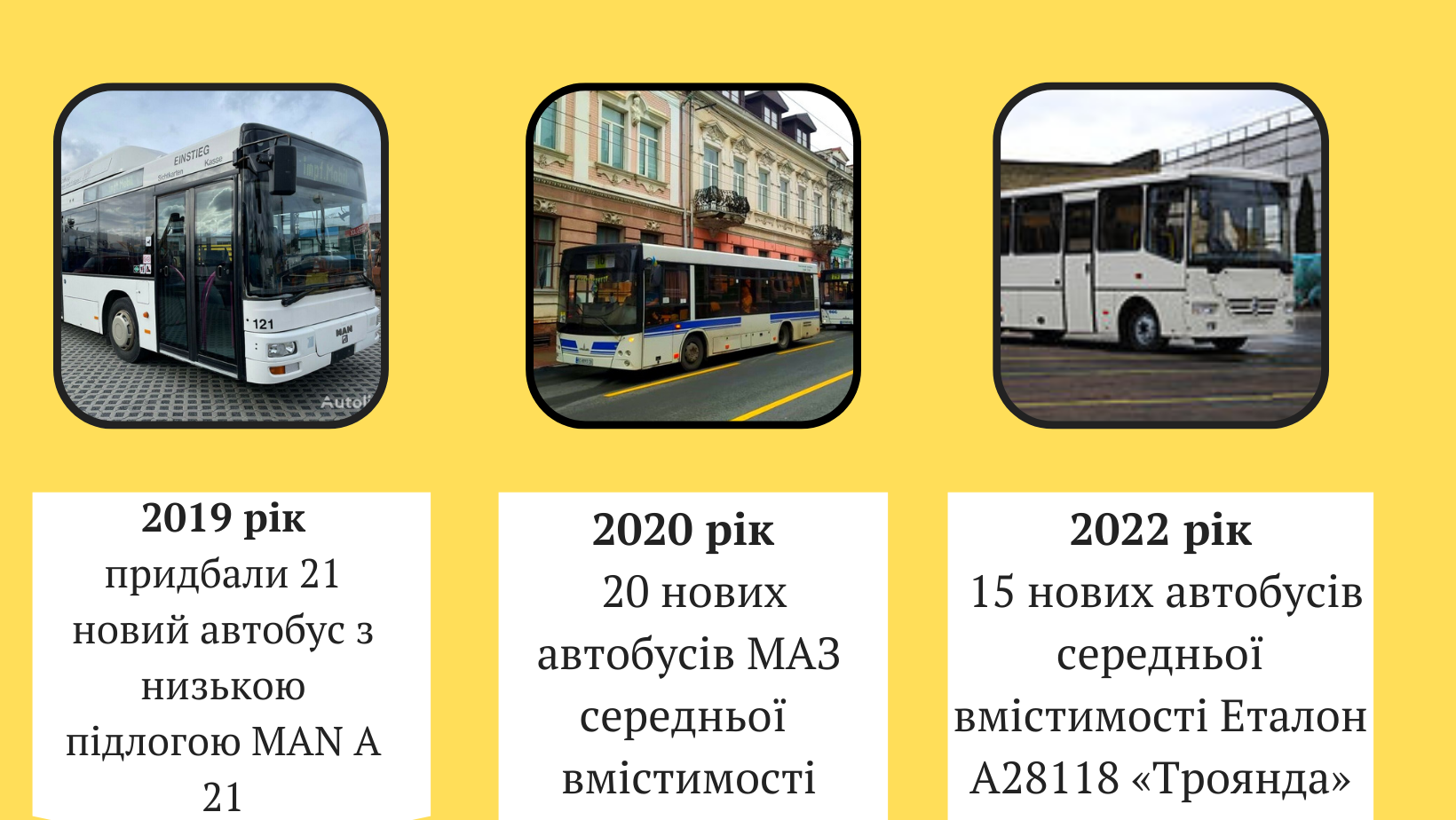 З метою оновлення пасажирського транспорту комунальне підприємство «Тернопільелектротранс» протягом трьох років – у 2019, 2020 та 2022 закуповували новий низькопідлоговий транспорт. Всього за три роки придбали понад 50 одиниць транспорту. Скільки у кожному році та який саме транспорт – дивіться на інфографіці нижче.