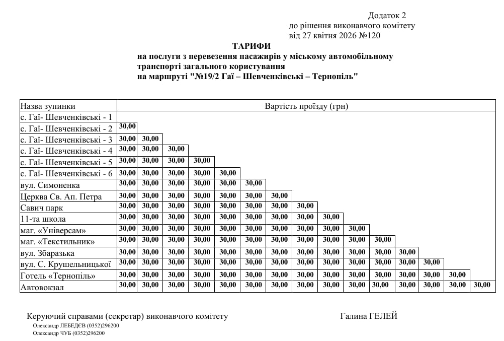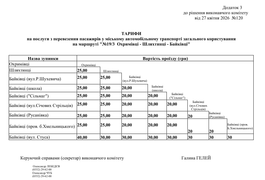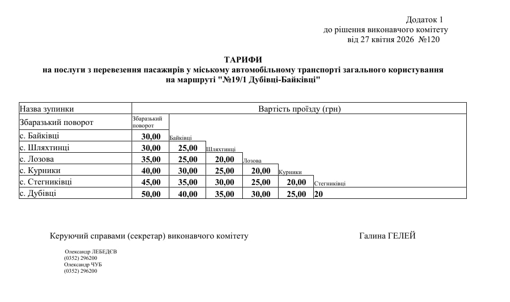 Виконавчий комітет сільської ради, розглянувши це клопотання, а також позитивний висновок незалежної аудиторської фірми, яка здійснила фахову перевірку поданих підприємцем розрахунків тарифів, вирішив з 1 травня 2026 року встановити нові тарифі на послуги з перевезення пасажирів автомобільним транспортом загального користування на маршрутах «№19/1 Дубівці — Байківці», «№19/2 Гаї-Шевченківські —Тернопіль», «№19/3 Охримівці — Шляхтинці — Байківці».