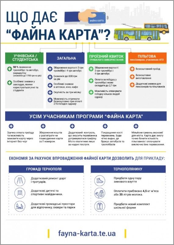 При цьому, вартість виготовлення електронного квитка «Соціальна карта тернополянина» відрізняється. Якщо вихочете отримати його у звичайному порядку - за 25 робочих днів, то він вартуватиме вам 65,00 грн. Якщо ж у терміновому порядку (2 робочих дні) – 125,00 грн.