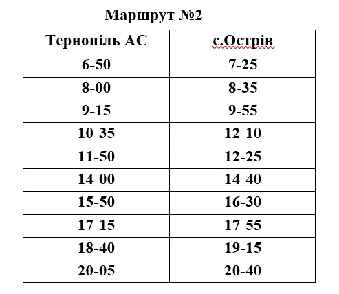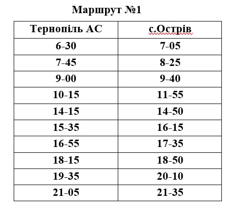 Тернопільська обласна військова адміністрація надала новий графік руху автобусу по маршруту «Тернопіль – Острів», який курсуватиме з 25 червня. Дивіться розклад нижче.