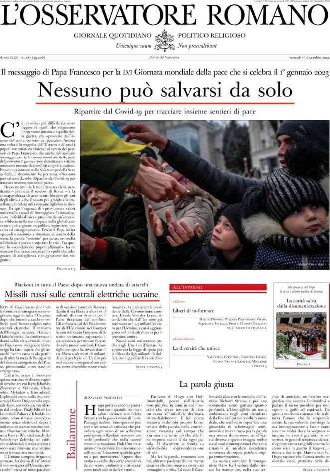 Є вірус, який перемогти важче, ніж ті, що вражають людський організм: це вірус війни, який виходить із серця, зіпсованого гріхом. В черговий раз трагедія України та всіх народів, змучених насильством, знаходиться в центрі думок Папи Франциска, який також у своєму щорічному посланні до Всесвітнього дня миру у січні наступного року не забуває про безневинні жертви, спричинені конфліктами щороку. Представлений сьогодні вранці у пресслужбі Святого Престолу документ має тему «Ніхто не може врятувати себе поодинці».