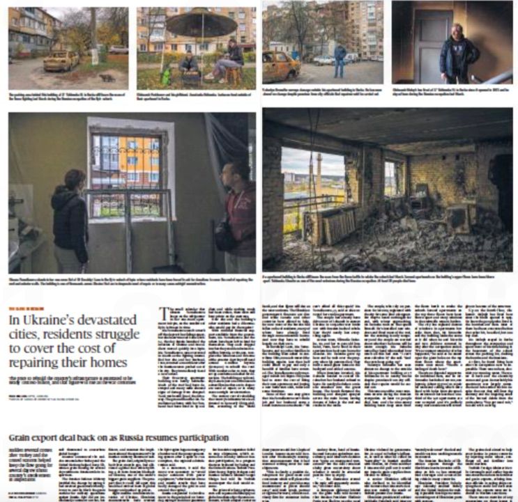 Спершу він вважав, що жити тут після окупації майже неможливо. Не було ні тепла, ні електрики, ні водопроводу. Вода повернулася, а електрика з'являється та зникає. Дивно, але його квартира залишилася майже недоторканою, і він знову влаштувався в ній, незважаючи на сажу, яка все ще вкриває сходи, і стійкий запах уламків, що згоріли з квартир нагорі. — До цього звикаєш, — сказав він, знизуючи плечима.